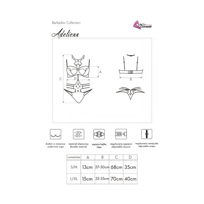 In de Adelienn Body - Zwart zie jij er super verleidelijk uit. Deze spannende body komt uit de Barbados serie van Livco Corsetti. De body heeft een prachtig opengewerkt design met sierlijke en speelse accenten. De beugel cups schijnen lichtjes door en zijn afgewerkt met romantisch bloemen kant. Over het decolleté loopt luxe kant en ook rond de hals en over de buik loopt het kant sierlijk door. De speelse bandjes over de heupen maken de sexy body helemaal af!
