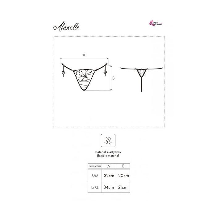 Hou je seksleven interessant met de Alanelle Boeien en String Set van Livco Corsetti. Deze set houdt je zeker geboeid met de speelse armbanden die aan elkaar bevestigd zijn met een goudkleurige, ketting. De boeien zijn gemaakt van transparante stof met geborduurde rode bloemen en zwarte lijnen. De rijgveters zorgen voor een extra speels effect. De boeien zijn ook zonder ketting te dragen als sierlijke armbanden.