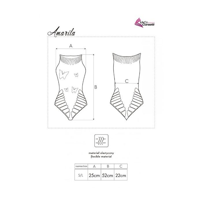 De Amarila Bodystocking is een body gemaakt van geweven stof. De zachte stof is rekbaar voor een perfect aansluitende pasvorm. De body heeft een mouwloos en kort model en schijnt licht door. Op de voorkant zijn strass steentjes aangebracht in vormen van vlinders. Dit geeft een sprankelend effect.