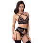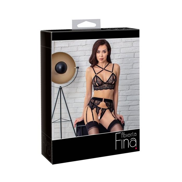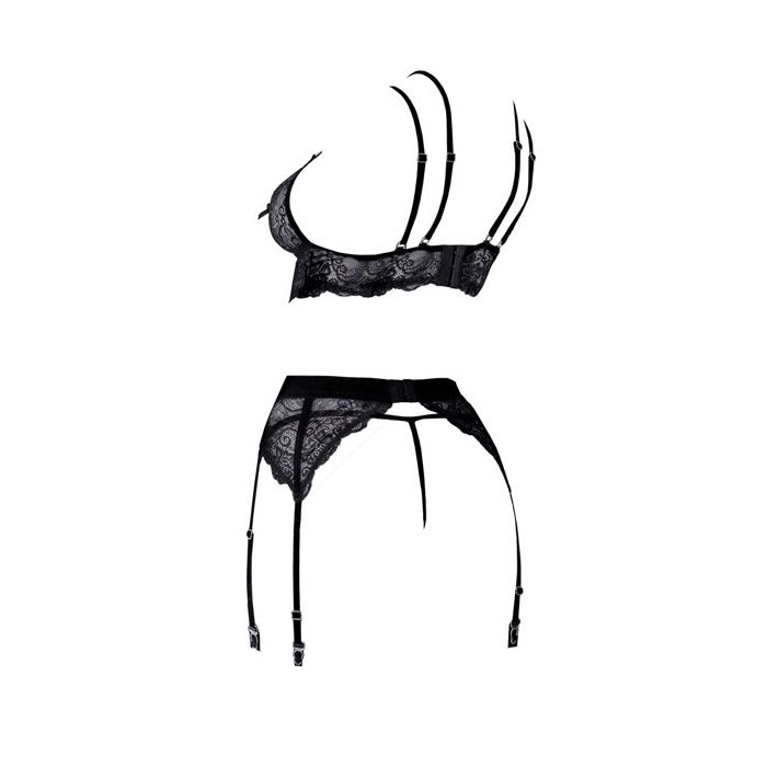De set bestaat uit een bralette bh, een jarretelgordel en een string. De bralette bh heeft kanten cups met peek-a-boo openingen en strikjes die de stof bijeen houden. Het kant loopt onder de cups naar een stukje door naar beneden, waar het kant geschulpt is afgewerkt. De schouderbandjes lopen gekruist over het decolleté en dubbel over de schouderbladen. De jarretelgordel zit hoog om de taille en het kant loopt sierlijk met jouw vrouwelijke lichaamsvormen mee.