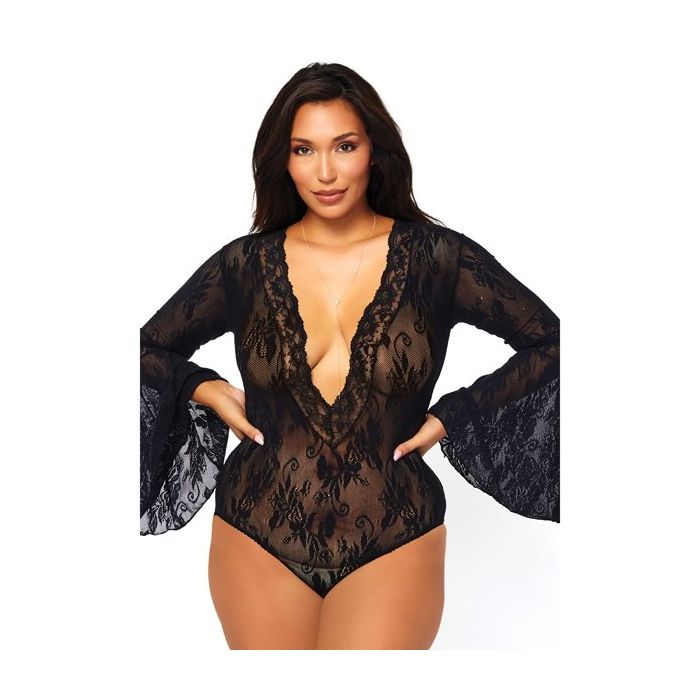 De Bell Sleeved Body van leg Avenue is een sierlijke en sexy body gemaakt van doorschijnend kant met een sierlijk bloemen patroon. De body heeft een laag uitgesnede V-hals die langs de randen is afgewerkt met een sierlijke rand van kant. De lange mouwen lopen wijd uit voor een gracieus effect. In deze body zul je zeker sexy voor de dag komen.
