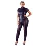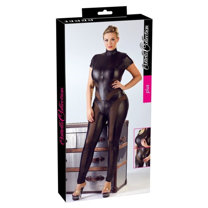 Ga voor een kinky look met het Broekpak met Transparante Stukken - Zwart. Deze spannende catsuit komt uit de Curves collectie van Cottelli. De catsuit heeft een figuur flatterende pasvorm, met korte mouwen en lange broekspijpen. Het broekpak is gemaakt van mat lederlook materiaal met inzetten van semi-transparant mesh.
