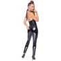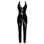 In deze spannende en vooral glanzende look zal je stralen van nek tot teen! Geniet van alles wat de Catsuit Met Halternek - Lak te bieden heeft. De catsuit is prachtig afgewerkt met zwarte lakafwerking en heeft een satijnen halternek om te strikken waardoor de catsuit geweldig zat staan. Dankzij de nauwsluitende pasvorm en steeds smaller wordende pijpen zullen je weelderige benen optisch langer lijken. Het hoogtepunt van de jumpsuit is de praktische, erotische 2-wegrits, die van het diepe decolleté via het kruis tot aan de billen loopt en van beide kanten snel te openen is. De jumpsuit is gemaakt van 100% polyester, polyurethaan coating.