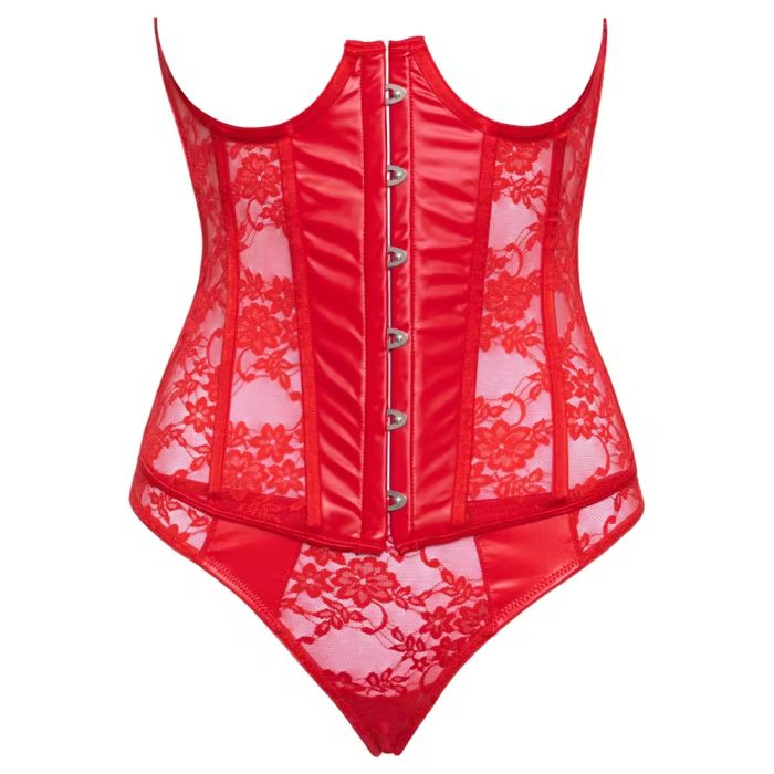 Dit setje in een betoverend rood is vervaardigd uit een luxe mix van kant en wetlook, waardoor het niet alleen een lust voor het oog is, maar ook een genot om te dragen. Het korset is ontworpen met een elastische en zachte stof die zich perfect aanpast aan jouw lichaam, wat zorgt voor een ongeëvenaard draagcomfort. De cup beugels bieden een subtiele ondersteuning voor je borsten, terwijl de zes geïntegreerde voorgevormde staafjes aan elke kant een prachtig silhouet creëren.