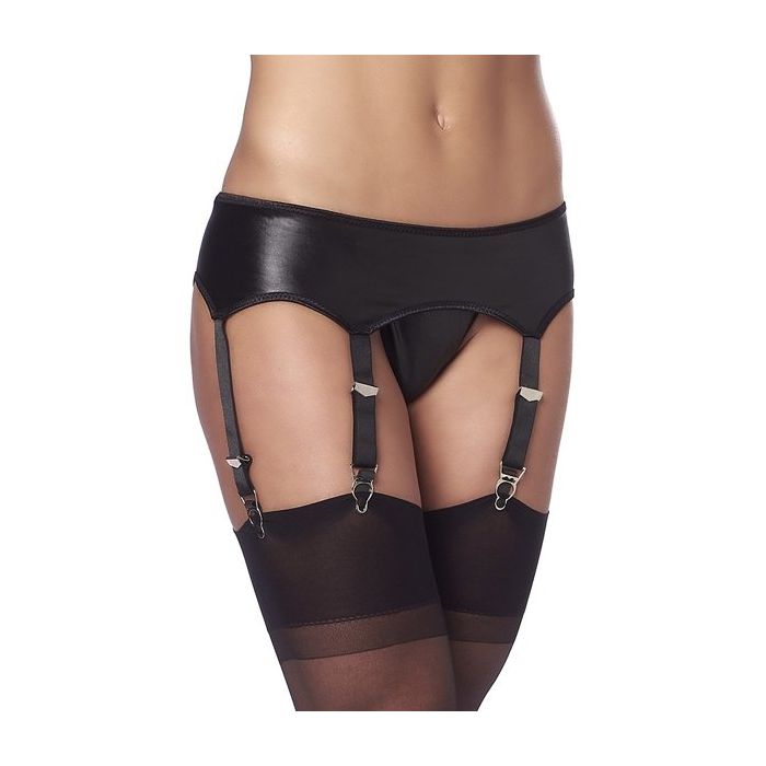 De Daring Wetlook Jarretel met String en Kousen van het Amorable label van het merk Rimba heeft een sexy retro design. De wetlook jarretel heeft een soepele pasvorm en maar liefst 6 verstelbare jarretelbandjes met retro metalen gespjes en aan de achterzijde is de jarretel voorzien van een haaksluiting. Bij de spannende jarretel wordt een wetlook string geleverd en een set kousen. Met deze set zal de toon zeker gezet zijn in de slaapkamer.