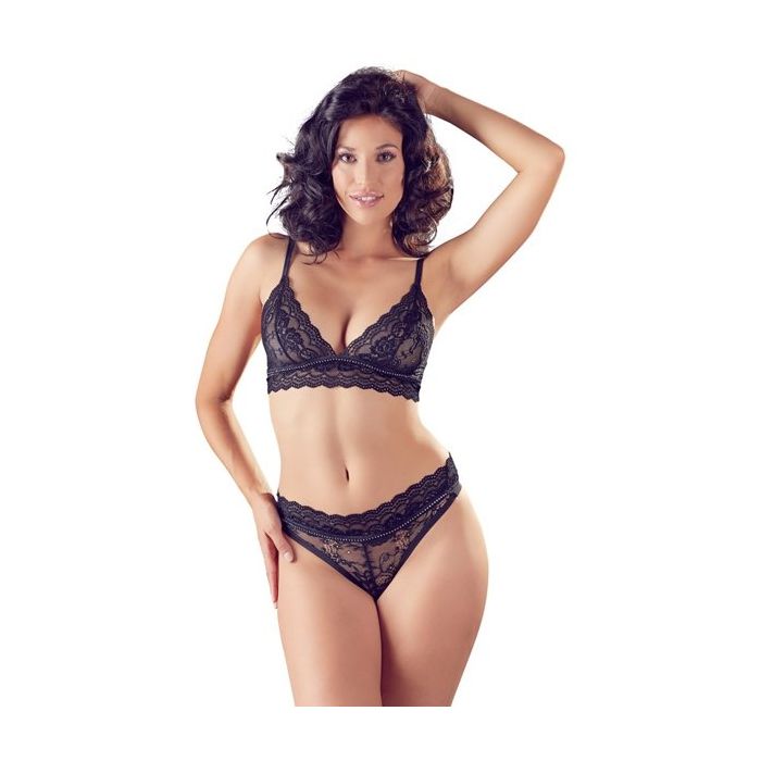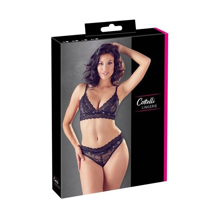 De Elegant Lace Set met Strass - Zwart is een prachtige aanwinst voor jouw lingerie collectie. Deze set van Cottelli Collection bestaat uit een kanten bralette bh en een bijpassende string van kant. Het weelderige bloemen kant schijnt verleidelijk door en heeft speels geschulpte randjes.