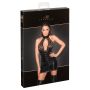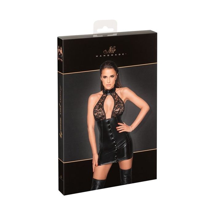 Het jurkje heeft een halter model met een stijlvol kraagje. Vanaf het kraagje loopt sierlijk bloemen kant over de borsten. Door het kant kan nog net een verleidelijke glimps opgevangen worden. Onder de cups begint de aangehechte wetlook rok die lekker strak rond jouw ronde vormen zit. In de voorkant zijn drukknopen gemaakt, waarmee jij het jurkje met een soepele beweging kunt ontdoen.