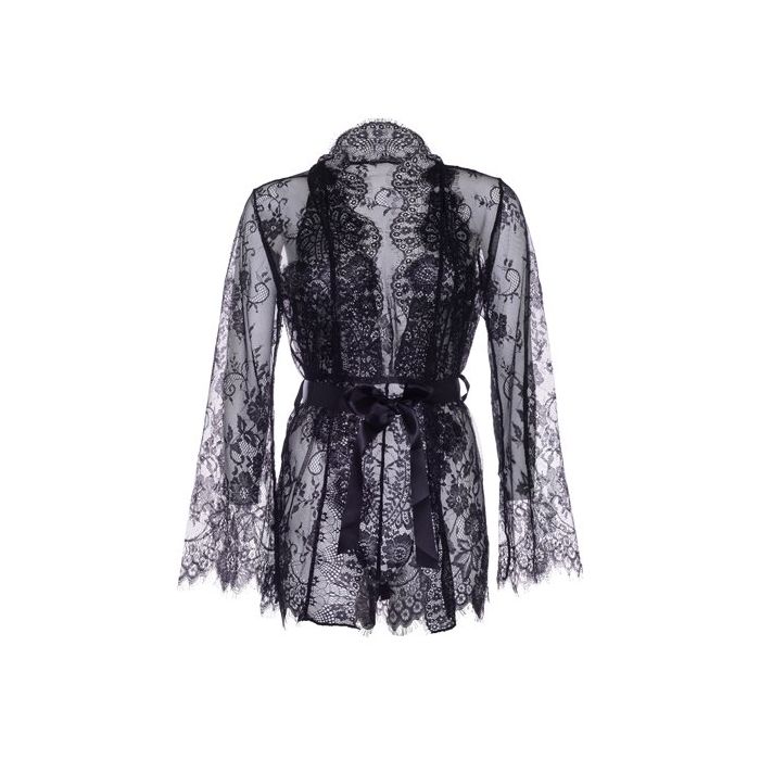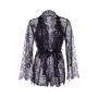 De kanten kimono heeft lange trompet mouwen en sierlijk geschulpte randen. Het los vallende model komt halverwege je billen. Dit geeft een super sexy uiterlijk. Knoop het satijnen strik ceintuur dicht of laat de kimono uitdagend open.