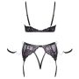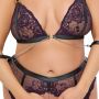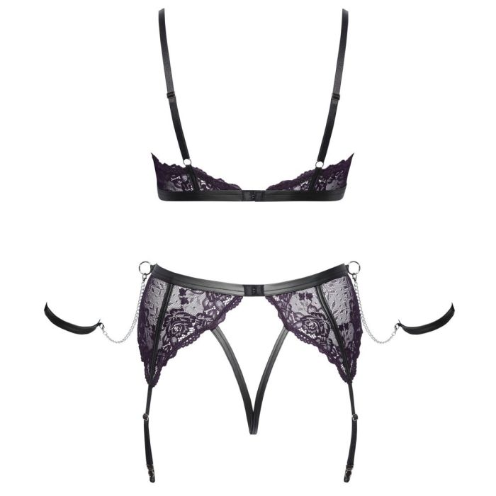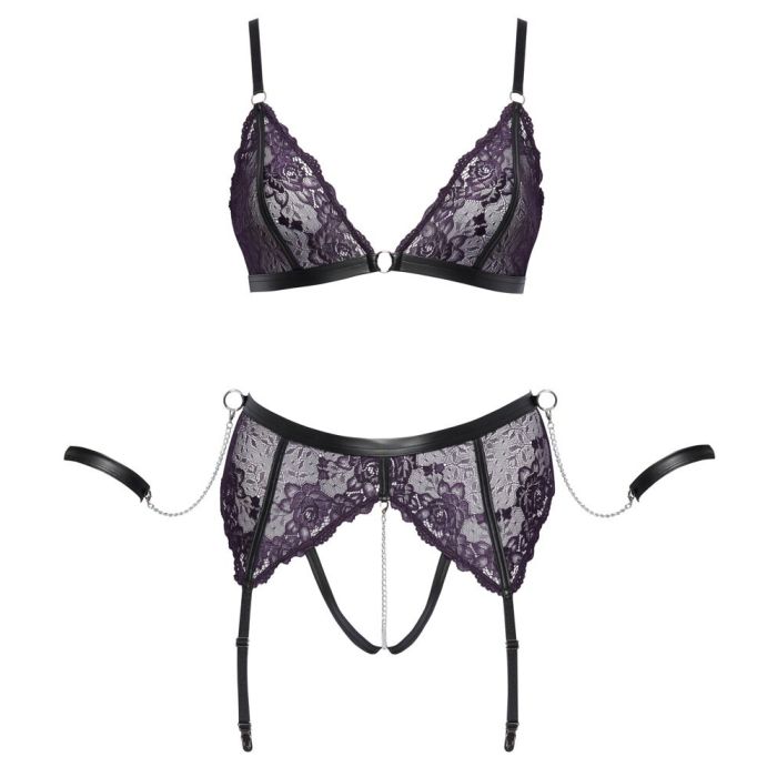 Ontdek de verleidelijke jarretelset van Cottelli, een perfecte combinatie van elegantie en sensualiteit. Deze set bestaat uit een zachte bh, een jarretelkoordje en twee comfortabele armboeien, allemaal vervaardigd uit fijn donkerpaars kant. De zwarte matte details en de glanzende zilveren ringen en kettingen voegen een luxe uitstraling toe, waardoor je je onweerstaanbaar zult voelen. De bh is ontworpen met zachte cups die je vormen prachtig accentueren, terwijl de verstelbare bandjes en haaksluiting op de rug zorgen voor een perfecte pasvorm.