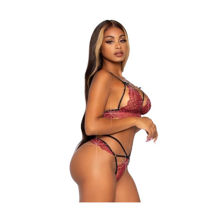 Jij bent een sprankelende verschijning in de Glitter Bralette en G-String - Bordeaux van Leg Avenue. Deze luxe set bestaat uit een bralette bh en G-string, beiden gemaakt van sierlijk bloemen kant. Het bloemen kant schijnt verleidelijk door en is versierd met schitterende strass steentjes.