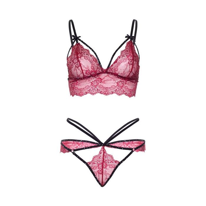 De bralette bh heeft ongevoerde en beugelvrije cups. De bh is met de verstelbare bandjes goed op maat te maken en in de rug is een bh sluiting gezet. De bralette en de string zijn afgewerkt met speelse bandjes.