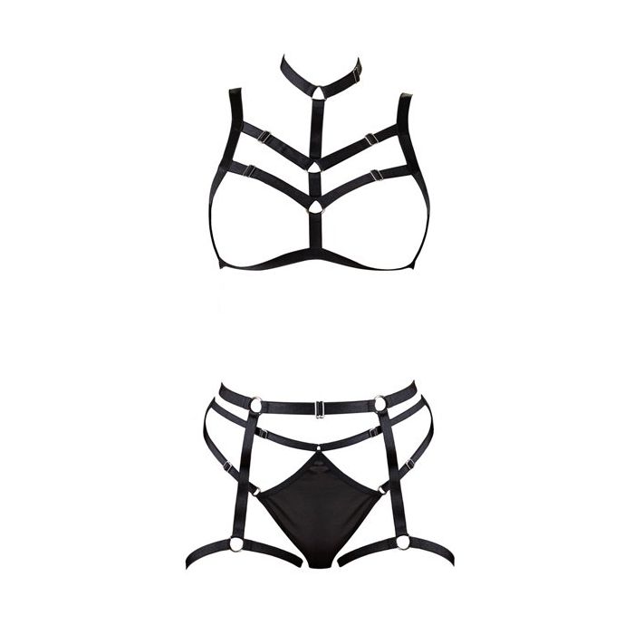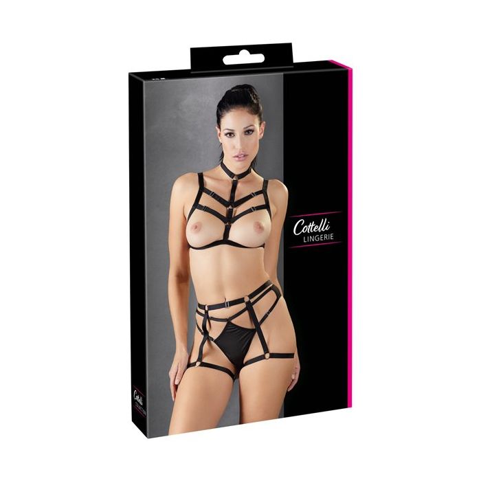 De decoratieve Harnas Set van het merk Cottelli Collection geeft jou een kinky look. Deze 3-delige set bestaat uit een bralette bh, een heup harnas en een bijpassende string. De bralette bh heeft open cups, waarin jouw borsten op uitdagende wijze omlijst worden door verstelbare bandjes. Over het decolleté lopen meerdere decoratieve bandjes en aan de bralette top is ook een choker halsband bevestigd.