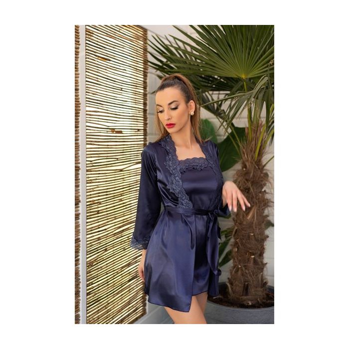 De charmante Jacqueline Nightwear Set - Blauw van Livco Corsetti bestaat uit 3 delen. De luxe set bevat een kimono, een chemise en een bijpassende string. De 3 elegante items hebben een prachtige blauwe kleur en zijn gemaakt van glanzend materiaal en kant. De kimono heeft lange, wijde mouwen en een strik ceintuur. Het ceintuur is speels te gebruiken om te verleiden. De chemise valt met haar gladde stof soepeltjes rond jouw lijf.