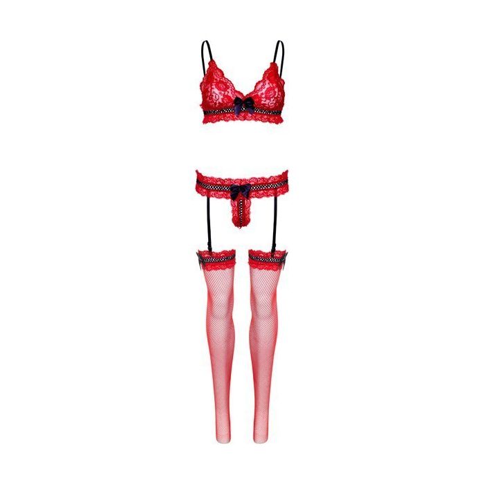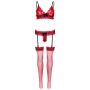 Naast dat de set zit als een droom, zie jij eruit als een droom in de bralette top en string van kant en spannende kousen van netstof. Het kant, de kanten ruches en de kousen van netstof zijn uitgevoerd in een prachtige rood tint en zijn afgewerkt met zwarte accenten. Aan de string zijn 4 jarretelbandjes gehecht, waaraan je gemakkelijk de kousen kunt bevestigen.