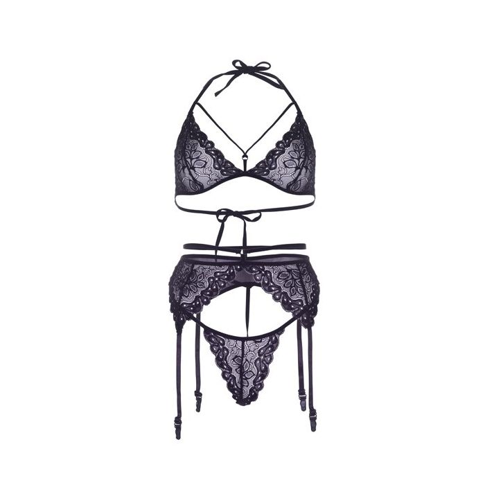 De bh heeft triangel cups van kant en een halter model met striksluiting in de nek en op de rug. De jarretelgordel is aan de voorkant van kant gemaakt en aan de achterkant van tule en heeft 4 verstelbare bandjes. Bij de set zit een bijpassende string.