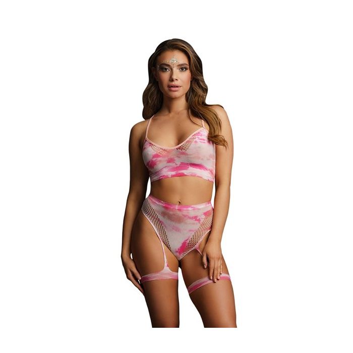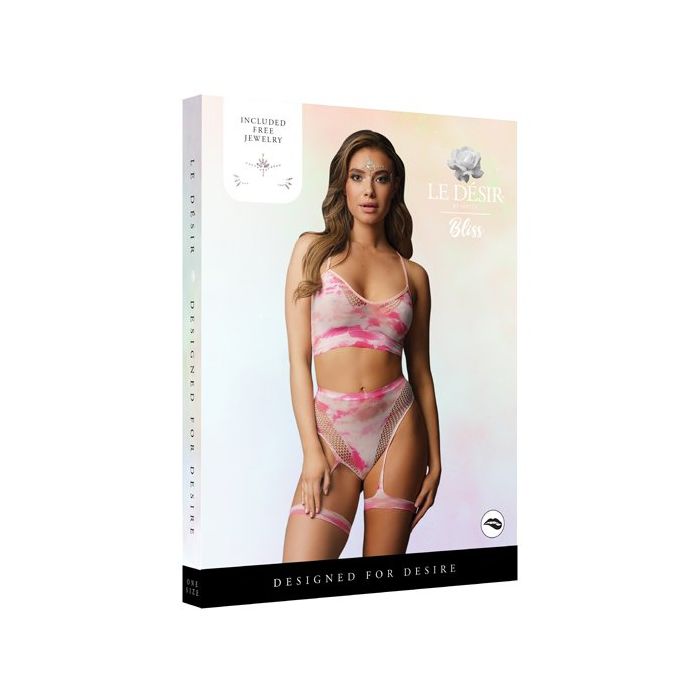 Voor de ultieme festival look ga je voor de 2-Delige Set met Stickers - Tie Dye Roze uit de Bliss lijn van Le Désir. Deze tweedelige behaset bestaat uit een top en een hoge string. De top heeft smalle bandjes en de string heeft aangehechte kousenbanden voor verleidelijke dijen.