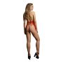 De babydoll heeft een halter model en een spannende open achterkant. Aan de achterkant wordt de babydoll dicht gestrikt met strik linten en de stof aan de voorkant valt hierdoor in een elegante A-lijn. Boven en onderaan is het jurkje afgewerkt met een randje wit, faux fur bont. Over de borsten is sierlijk kant aangebracht met uitsparingen aan de onderkant voor een spannende look. Bij de babydoll ontvang je een bijpassende rode string met strik linten.