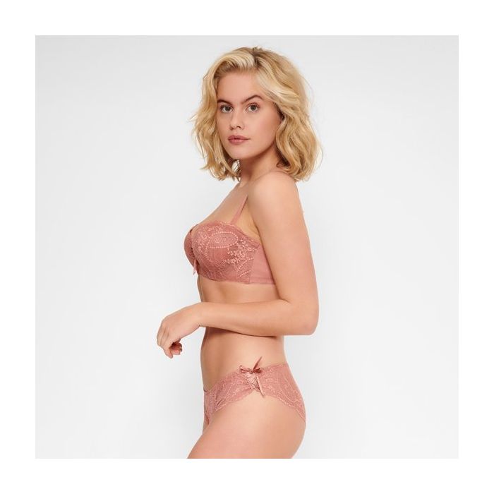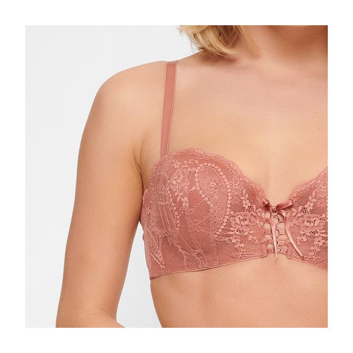 De balconette bh heeft voorgevormde cups. In de cups zijn ondersteunende beugels verwerkt wat aan de voorkant niet meteen te zien is. Het sierlijke kant steekt rafelig over de bovenrand van de cups uit. Tussen de cups is een rijglint ingezet voor een romantische aanblik. In de achterkant is een handige haaksluiting gezet. De verstelbare schouderbandjes zijn tevens afneembaar voor een elegante strapless look.
