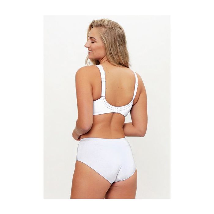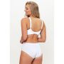 Het sierlijke bloemen kant heeft geschulpte randjes. Het witte kant geeft een heerlijk romantische look. De schouderbandjes zijn breder dan standaard bh bandjes en het kant loopt erover door. De brede band rondom draagt bij aan de goede steun die deze bh biedt. Op de rug is een haaksluiting met 3 standen gemaakt.