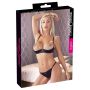 Deze tweedelige set bestaat uit een kwart cup bh en een bijpassende string. De bh en de string zijn gemaakt van zwart, fluweelzacht satijn voor een mysterieus karakter. Tussen de cups en aan de voorkant van de string zijn kleine bedeltjes bevestigd. Over de open cups en over de achterkant van de string hangen strass kettingen. Dit geeft de set een high fashion uiterlijk.