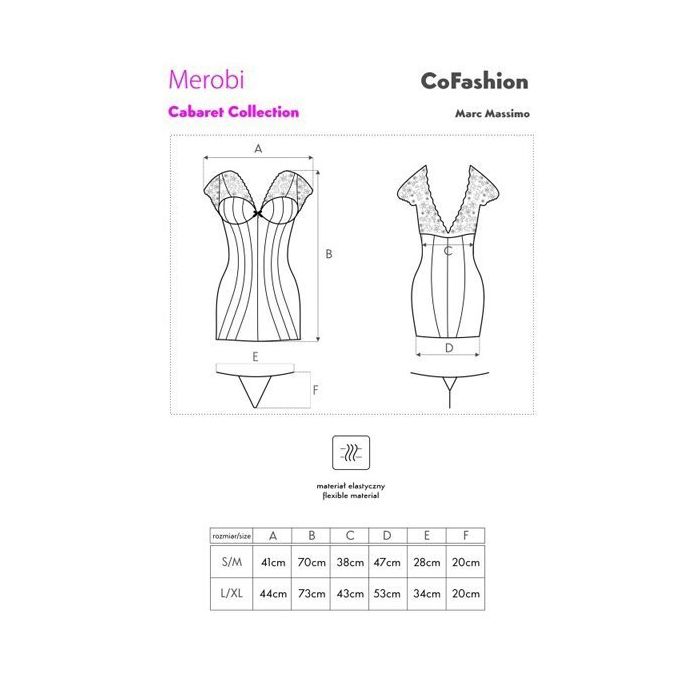 De stijlvolle Merobi Chemise met String komt uit de Cabaret collectie van het merk CoFashion. Deze fashionable chemise is gemaakt van heerlijk zachte en soepele stoffen voor een geweldige, nauwsluitende pasvorm. De cups zijn niet gevoerd of voorgevormd, maar wel voorzien van elastische stiknaden die onder de borsten door lopen voor een goede ondersteuning en toch een natuurlijke boezem.
