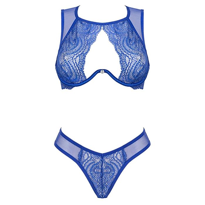 Maak je partner stapelgek en draag deze sexy lingerie set van het merk Obessive. De set bestaat uit een kanten bh en een kanten G-string. De bh heeft verstelbare bandjes zodat je de bh aan jouw maten kunt aanpassen voor een perfecte pasvorm. De string maakt de spannende set helemaal compleet. Verken elkaar intieme zones en maak er een spannende nacht van met de Obessive Lingerie Set Giselia - Blauw.