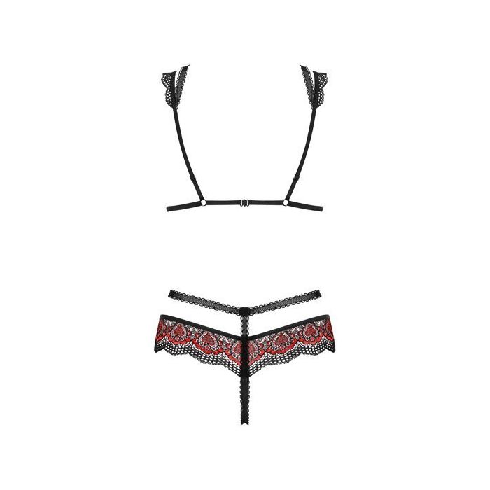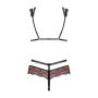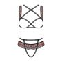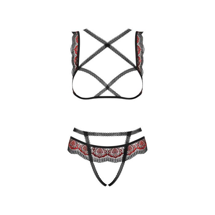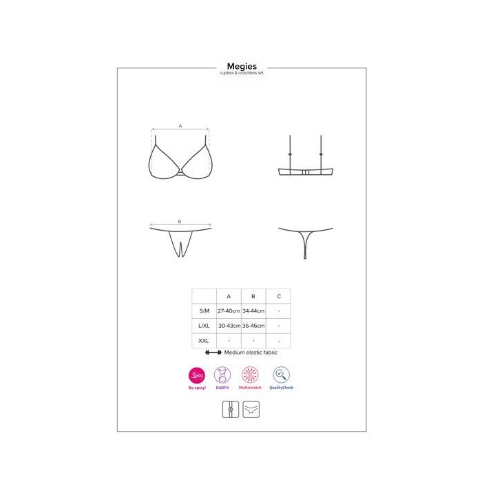 De tweedelige Megies Lingerie Set komt uit de Megies serie van het merk Obsessive. Dit sexy setje bestaat uit een bh met open cups en een string met een open kruis. De set is opgebouwd uit speelse bandjes met een sierlijke afwerking. Aan de bandjes is tweekleurig kant gehecht voor een romantische uitstraling.