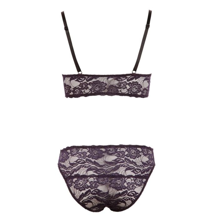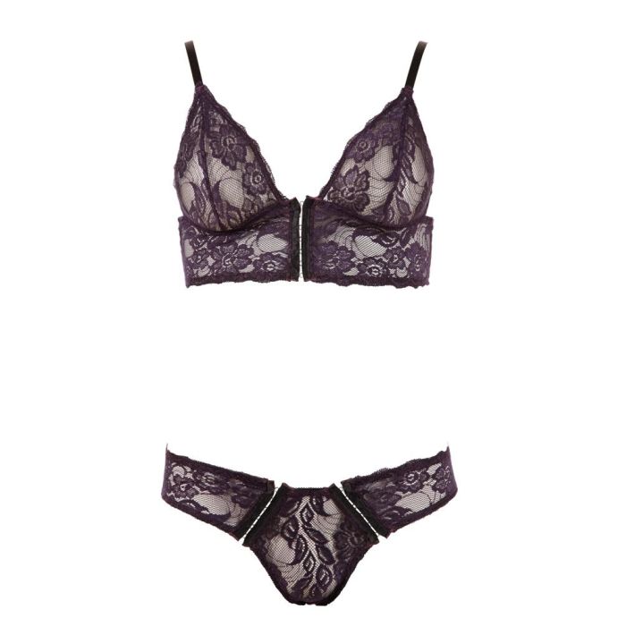 In de BH en Slip Wanda - Paars van Cottelli Collection zul jij je heel ondeugend en sexy voelen. Deze prachtige set bestaat uit een longline bralette bh en slip, gemaakt van paars kant met een sierlijk bloem motief. De bh heeft verstelbare bandjes en de driehoekige kanten cups hebben geen beugels voor een hoog draagcomfort. Zowel de bh als de slip hebben haaksluitingen voor stoute plaag spelletjes waar je partner helemaal wild van zal worden.