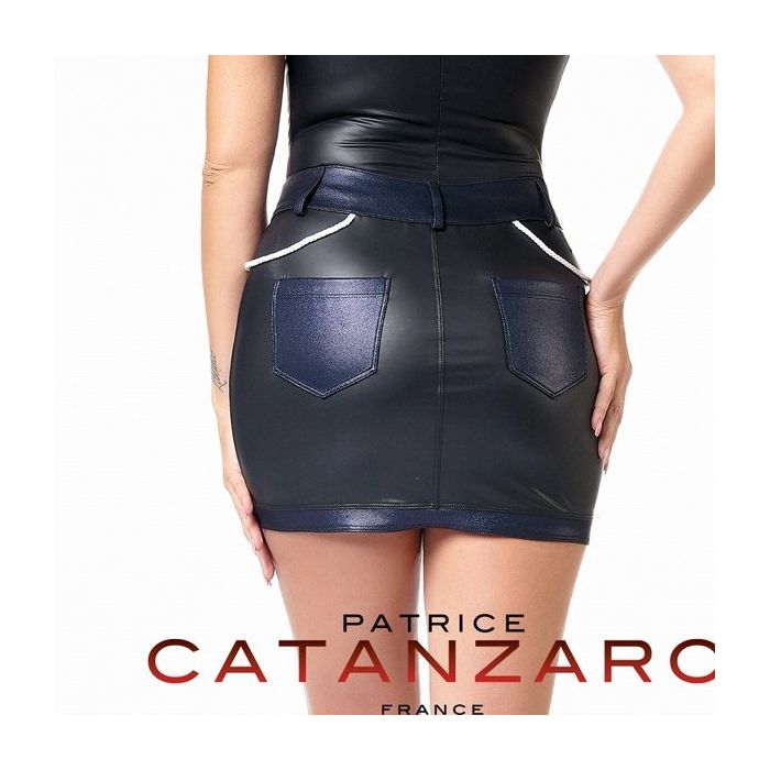 Het Peggy Mini Rokje - Zwart / Blauw is een stijlvol design rokje gemaakt van mat zwart kunstleer uit de collectie van het fantastische fashion merk Patrice Catanzaro. Het strakke rokje is gemaakt van hoogwaardige materialen voor een aangename en perfecte pasvorm. Het rokje heeft een brede tailleband gemaakt van denim look materiaal met metallic afwerking, deze denim stof komt terug in de rand onderaan het rokje en ook de achter zakjes zijn gemaakt van deze speelse blauwe stof. Het rokje is voorzien van een gulp met rits en 2 drukknopen in de tailleband, waar ook lussen voor een riem op zijn aangebracht. De tailleband is afgewerkt met speelse touwen met metallic afwerking voor een maritieme sfeer.