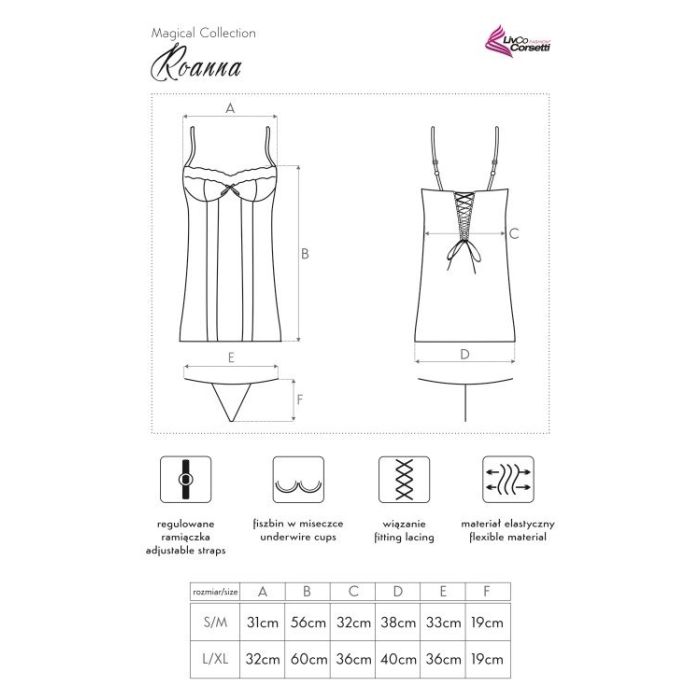 In deze elegante chemise uit de Magical Collection van Livco Corsetti zul jij er zeker magisch mooi uitzien. Het Roanna Jurkje heeft een nauwsluitend model en is gemaakt van zacht, elastisch materiaal dat heerlijk aanvoelt rond je lichaam en je vormen prachtig laat uitkomen. De sierlijke met kant afgewerkte cups zijn voorzien van ondersteunende beugels en met de verstelbare bandjes maak je de cups en de chemise goed passend. De chemise wordt geleverd met een bijpassende string.