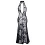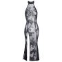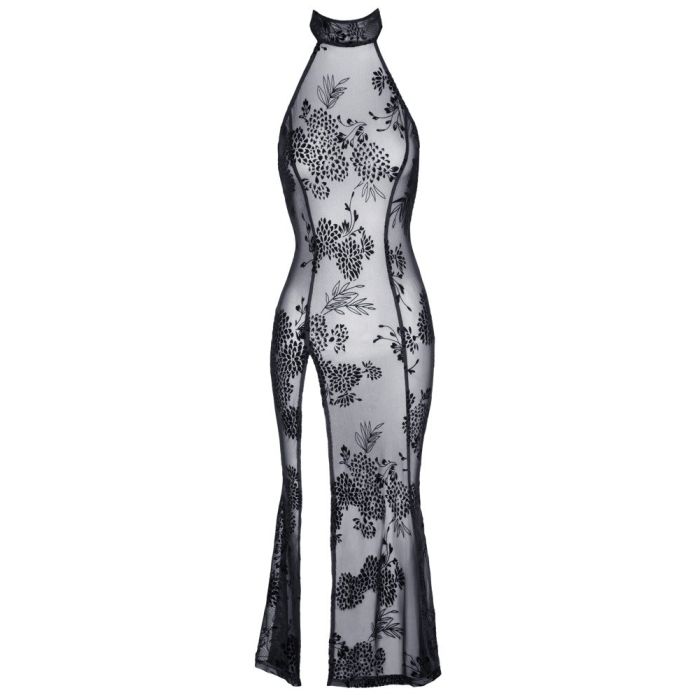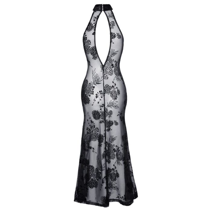 Deze Sensuele lange jurk van Noir Handmade is gemaakt van elastische powernet met een fijne fluwelen flockprint in een prachtige bloemen print. De jurk heeft een extra hoge split aan de zijkant, opstaande kraag en een diepe ovale rug halslijn. Op de openstaande kraag aan de achterkant is een knoopje aangebracht.