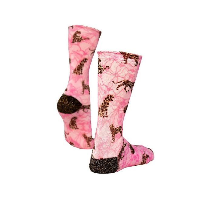 De Sock My Lacy Jaguar - Dames Sokken zijn super comfortabele sokken met een uniek design! De sokken zijn gemaakt van hoogwaardig Egyptisch katoen en zijn naadloos op de tenen voor een opmerkelijk hoog draagcomfort. De sokken hebben een prachtige kleurrijke print van roze kant en kleine luipaardjes. De hiel en de tenen zijn gemaakt van contrasterende zwarte stof waarin glitter garen is verweven voor een sprankelend effect.