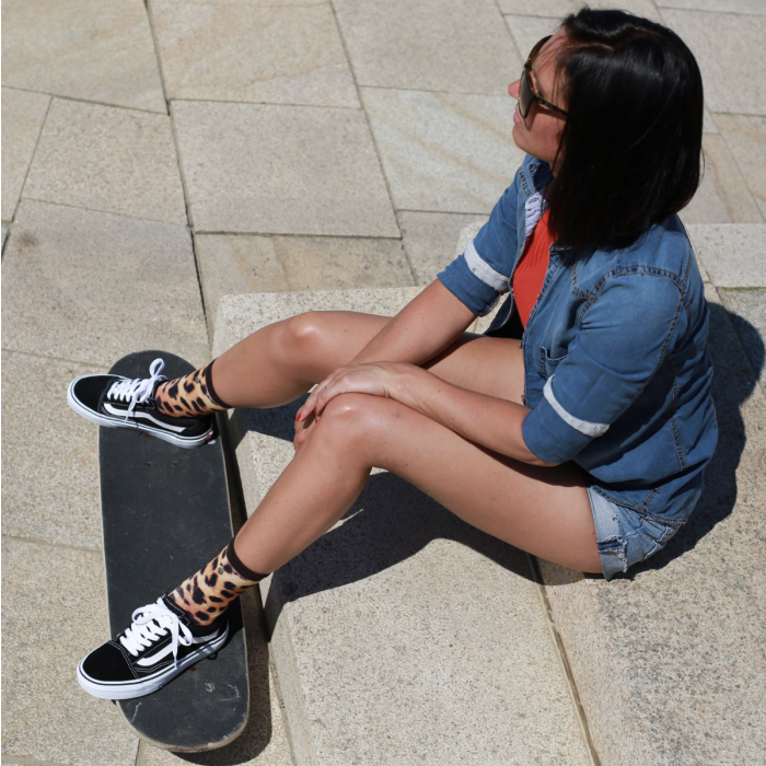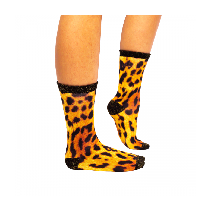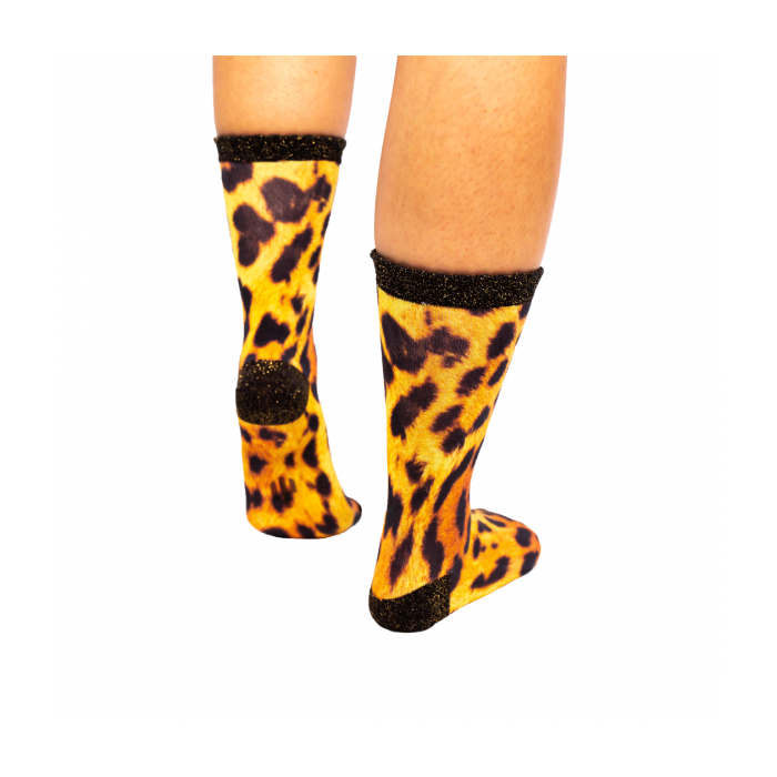 De Sock My Tiger - Dames Sokken zijn super comfortabel en strelen jouw voeten! De sokken zijn gemaakt van heerlijk zacht en luchtig Egyptisch katoenen zijn naadloos op de tenen. De Tiger heeft een prachtige foto print van een panter pels, geen tijger strepen dus. De hiel, de tenen en de piqué boord zijn gemaakt van contrasterende zwarte stof waarin glitter garen is verweven voor een sprankelend effect.