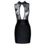 Dit prachtige mini jurkje van Noir Handmade is gemaakt van mat zwarte stof in combinatie met transparante stof met fluwelen flockprint. Door de combinatie van elastische materialen heeft het de perfecte pasvorm en zorgt het voor een hoog draagcomfort. De opstaande kraag sluit met 2 kleine knoopjes aan de voorkant.