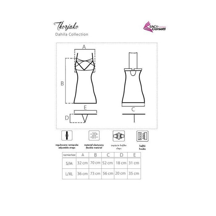 De chemise heeft een nauwsluitende pasvorm en een licht uitlopend A-lijn model. De cups zijn niet gevoerd en uitgevoerd zonder beugels voor een natuurlijke buste. Over het laag uitgesneden decolleté is sierlijk bloemen kant gespannen. De chemise heeft smalle verstelbare schouderbandjes en een haaksluiting op de rug. Bij het jurkje wordt een bijpassende string geleverd.