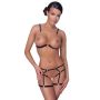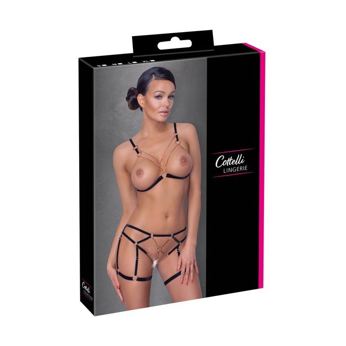De bh heeft zwarte, verstelbare schouderbandjes en een zwart bandje rondom en onder de borsten door. De cups zijn helemaal open en boven de borsten langs zijn kettingen en ringen aangebracht. De kettingen en ringen komen terug in de jarretel slip, met name in het open kruis van de slip. De zwarte bandjes zitten als een slipje rond jouw taille en dijen. De kettingen en ringen zijn uitgevoerd in romantisch rosé-goud kleur.
