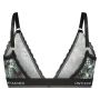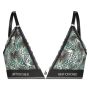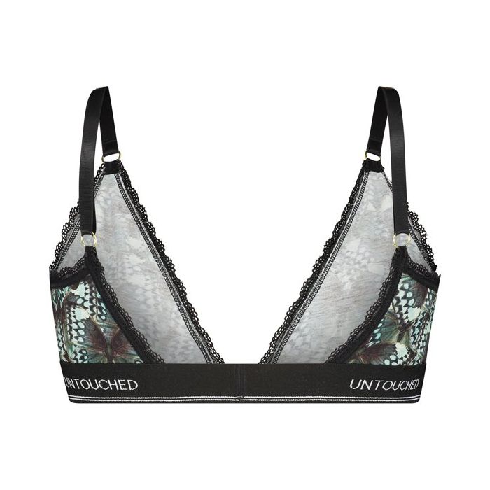 De bralette heeft ongevoerde en beugelvrije triangel cups. Onder de cups loopt een brede elastische band met het Untouched logo. De zwarte band geeft ondersteuning en een sportieve uitstraling. De bralette bh is bedrukt met een kleurrijke en slijtvaste fotoprint van prachtige groene vlinders.