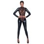 De jumpsuit is gemaakt van stretch wetlook en zacht micro mesh. De jumpsuit heeft lange mouwen en een stijlvol opstaand kraagje. De voorkant is geheel gemaakt van semi-transparant micro mesh met een zachte Flock Print. De zachte Flock Print heeft het patroon van tijger strepen. Beestachtig lekker dus.