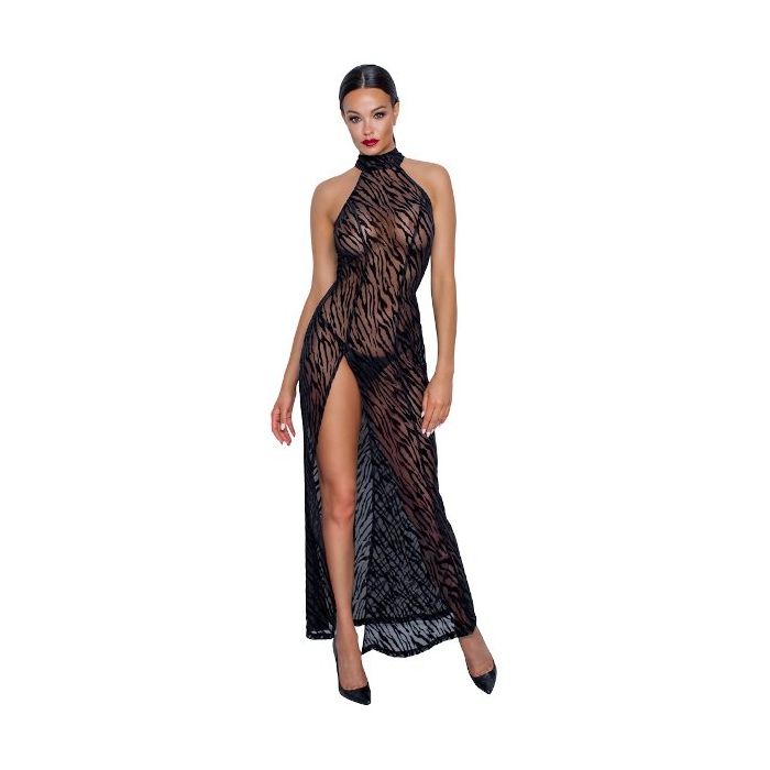 De jurk is geheel gemaakt van powernet micro mesh. Het mesh voelt heerlijk zacht aan en houdt niets van jouw verborgen. Op het mesh is een luxe Flock Print aangebracht dat fluweelzacht aanvoelt. De Flock Print is aangebracht in een spannend patroon van tijger strepen. Beestachtig lekker!