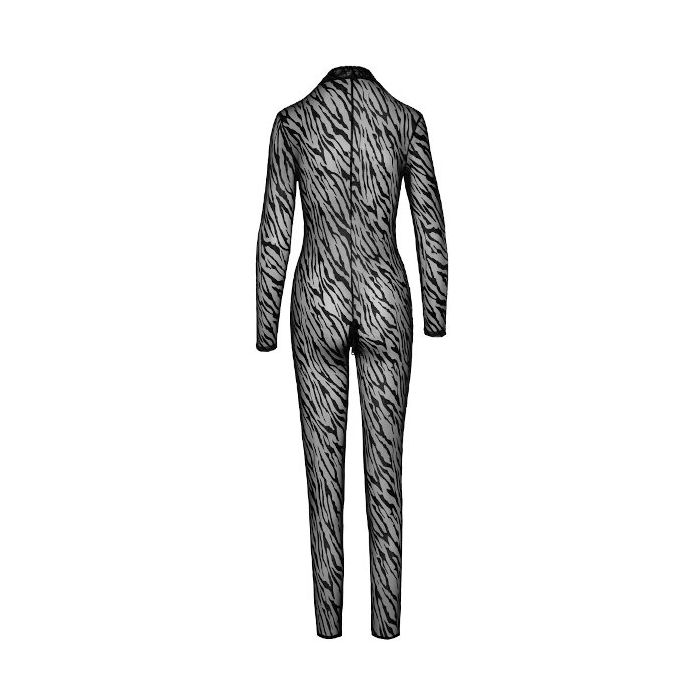 Het semi-transparante micro mesh laat niets aan de verbeelding over. Op het mesh is een zachte velours Flock Print aangebracht in een spannend tijger strepen patroon. De jumpsuit heeft een lang model met een elegant opstaand kraagje. Vanaf het opstaande kraagje loopt er een 2-way rits over de voorkant naar beneden, over het kruis en door naar de onderrug voor easy access!