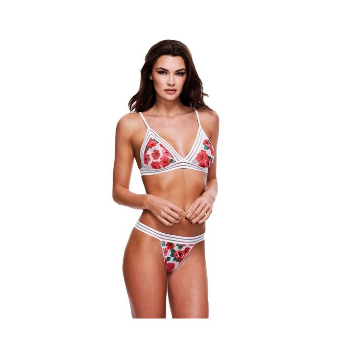De White Floral and Sport Lace BH Set van Baci is een zomerse bikini lingerie set. De tweedelige set bestaat uit een triangel top en een tanga slip. De top en string zijn gemaakt van heerlijk zacht stretch materiaal met een fleurige bloemen print. De randen zijn afgewerkt met brede boorden van gestreept kant.