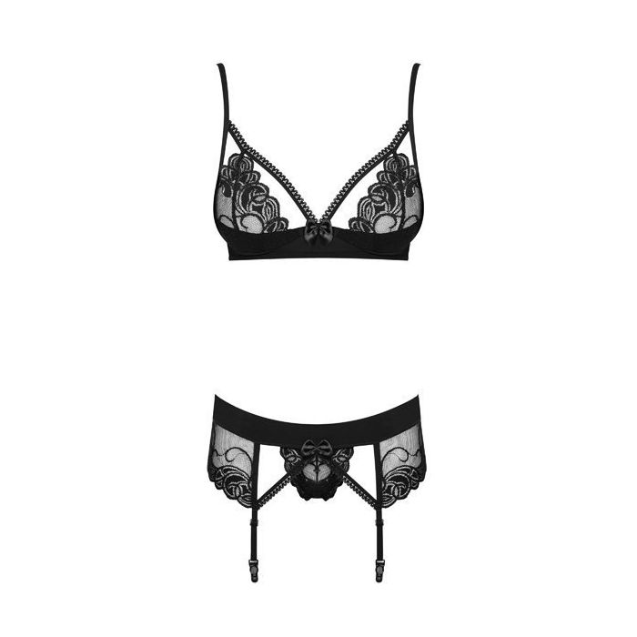 Beleef een wonderlijke tijd met de Wonderia Set - Zwart van het merk Obsessive. Deze driedelige set bestaat uit een bh, een jarretelgordel en een bijpassende string. De beugel bh heeft cups die deels gemaakt zijn van zwarte gevoerde stof en deels van luxe doorschijnend kant en speelse bandjes voor een open en bovendien verleidelijke uitstraling. Het sierlijke kant en de speelse bandjes komen terug in de stijlvolle jarretelgordel en in de string.